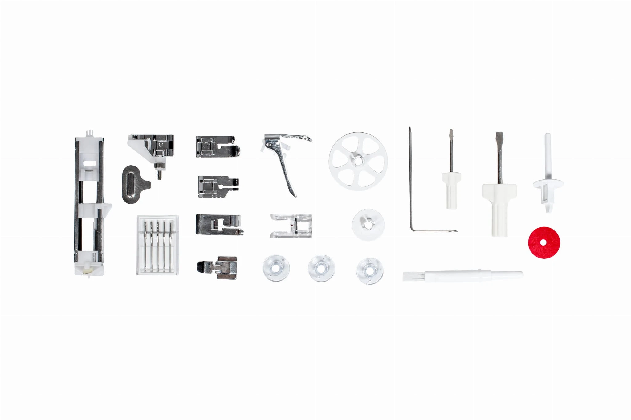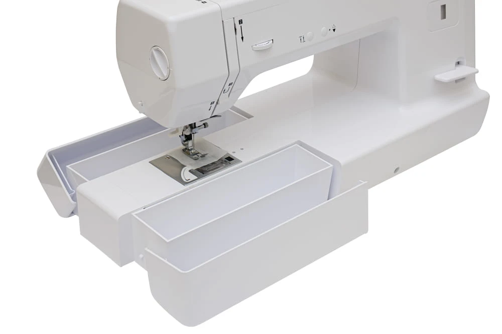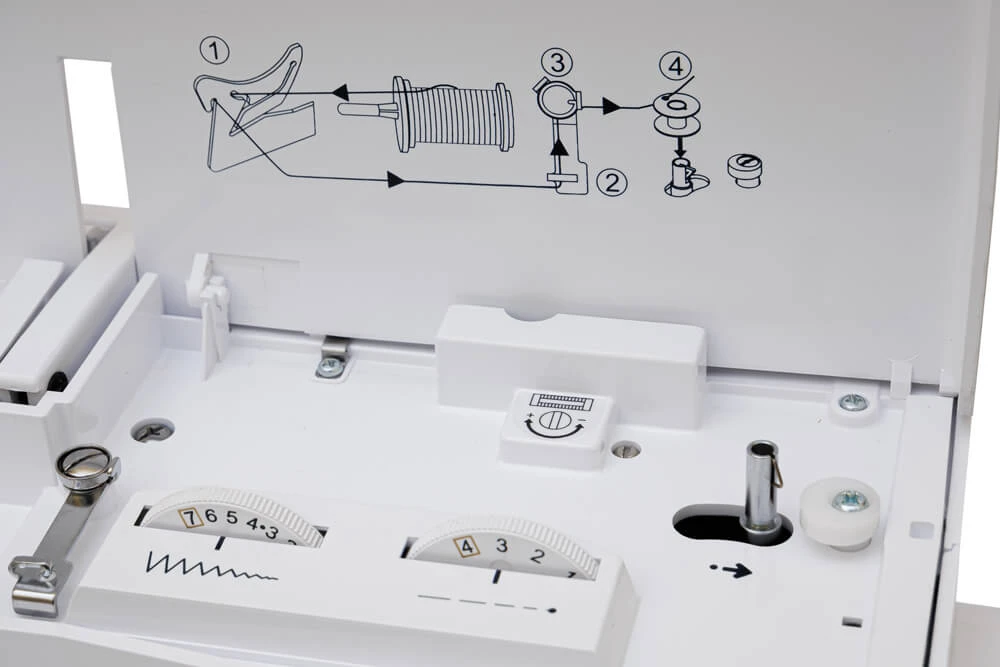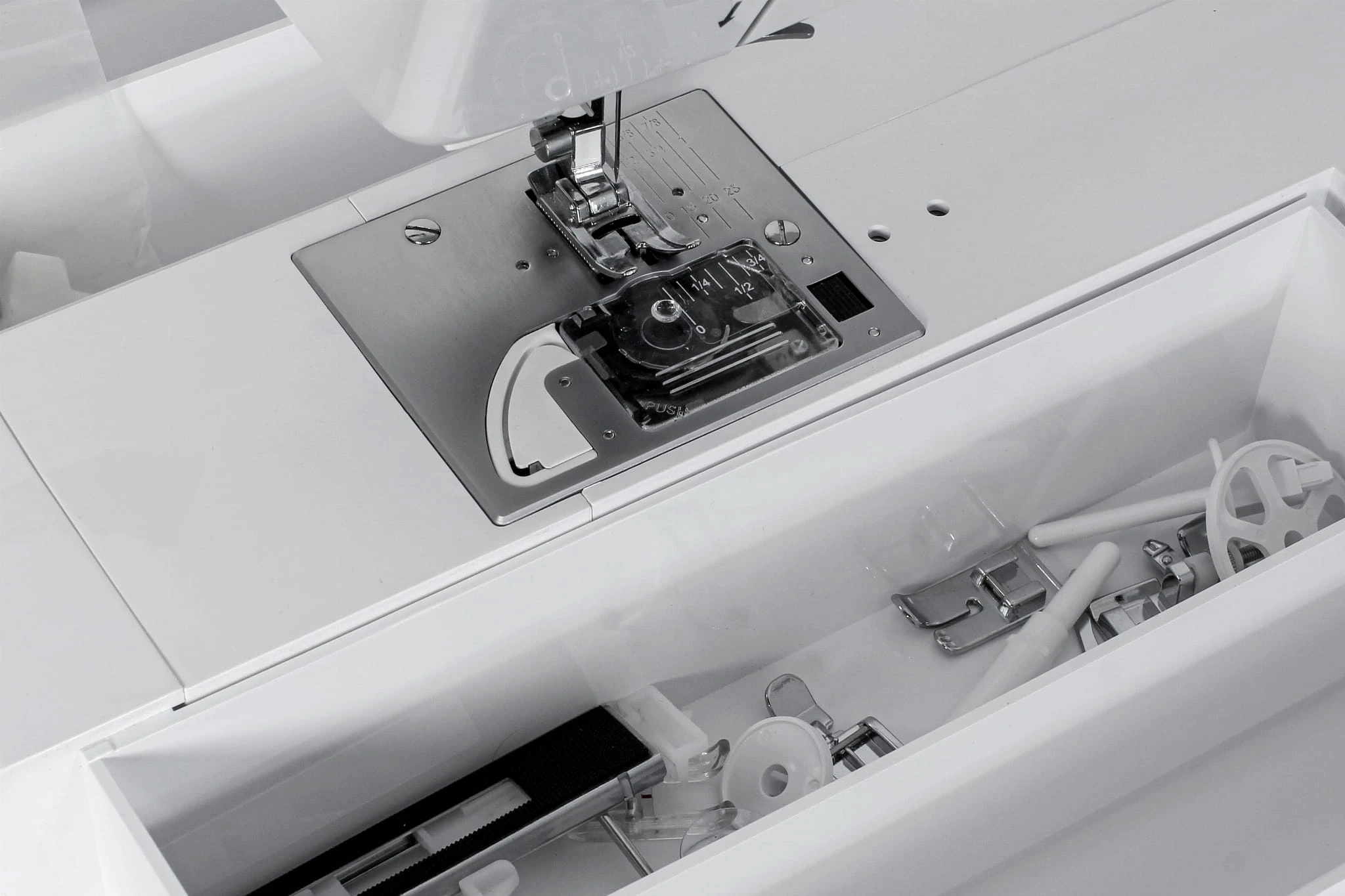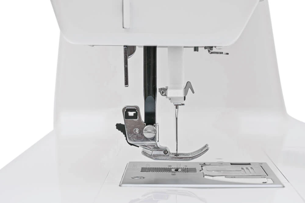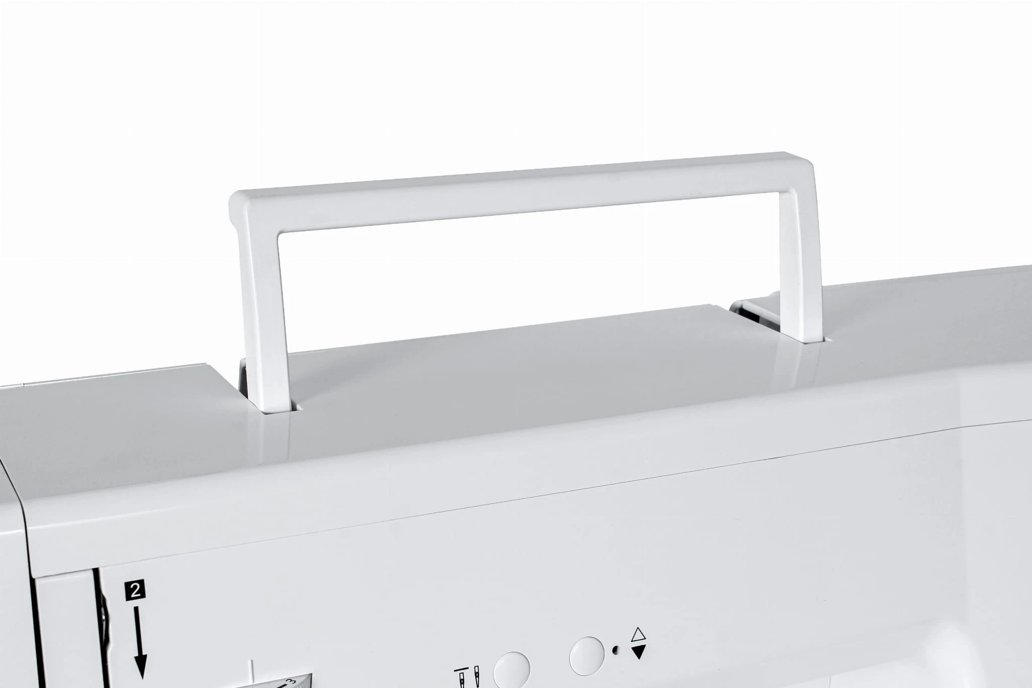 Maszyna została wyposażona w automatyczny nawlekacz igły, który skraca przygotowanie do pracy. Regulacja docisku stopki umożliwia szycie różnych materiałów – od cienkich tkanin po jeans czy warstwy patchworku. Funkcja wyłączanego transportu pozwala na cerowanie, haftowanie oraz quilting swobodny. Wolne ramię ułatwia szycie rękawów i nogawek. Dodatkowy kolanowy podnośnik stopki zwiększa ergonomię i pozwala sterować materiałem obiema rękami.