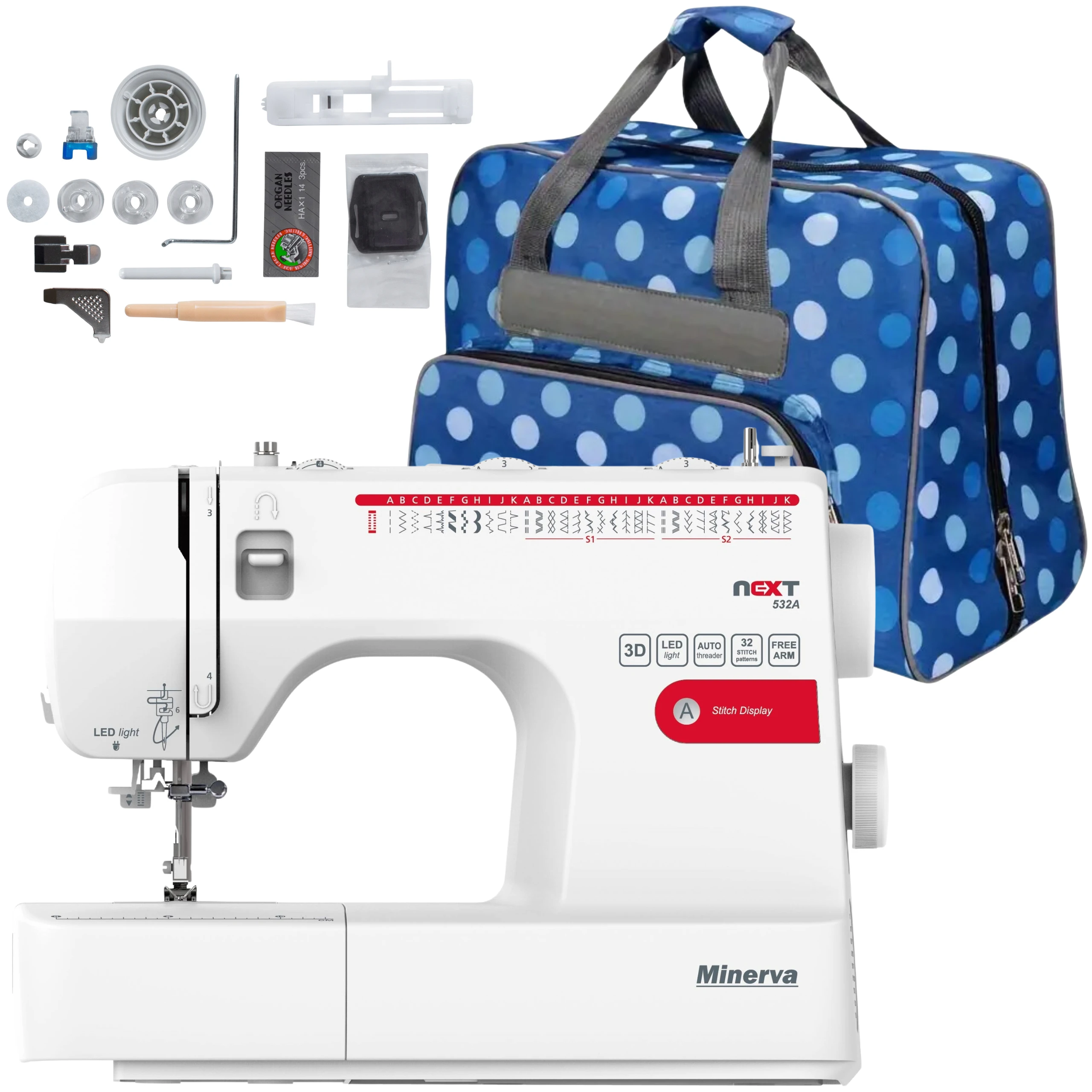 Maszyna posiada szereg funkcji podnoszących ergonomię i wydajność pracy, m.in. automatyczny nawlekacz igły, automatyczne obszywanie dziurek na guziki, regulację długości i szerokości ściegów, boczny obcinacz nici oraz regulację docisku stopki. Udoskonalony transport materiału zapewnia pewny przesuw tkanin, a rzadsza konieczność regulacji stopki przyspiesza szycie. Dzięki temu Minerva Next 532A sprawdzi się zarówno przy cienkich, jak i grubych materiałach.