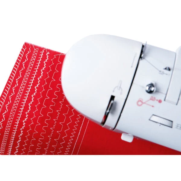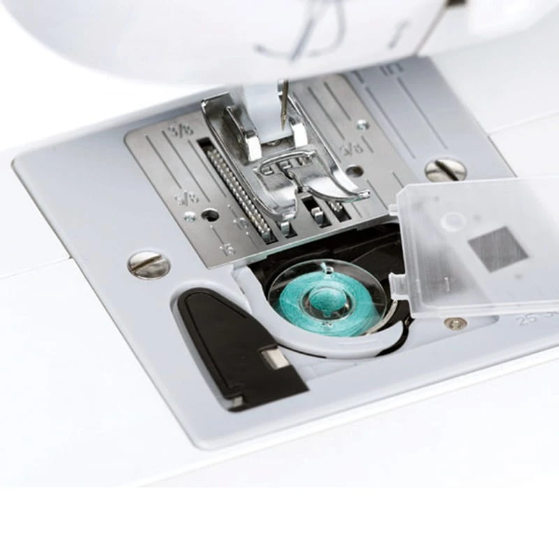 Dostępne są 23 wbudowane wzory ściegów, w tym podstawowe ściegi, ściegi owerlokowe, ściegi rozciągliwe, ściegi ozdobne, kryte, a także prosta, 4-stopniowa dziurka na guziki. Ściegi są widoczne na pokrętle selektora ściegu - wystarczy obrócić pokrętło, aby wybrać ścieg. Oświetlenie LED oświetla obszar pracy dzięki czemu widoczność podczas szycia jest bardzo dobra. Maszyna jest wyposażona w nowoczesny chwytacz rotacyjny co czyni ją cichą, łatwą w obsłudze, a przejrzysta osłonka ułatwia kontrolę dostawy nici dolnej podczas szycia. Wbudowany nawlekacz igły sprawi, że nitkę w igłę nawleczesz w mgnieniu oka!