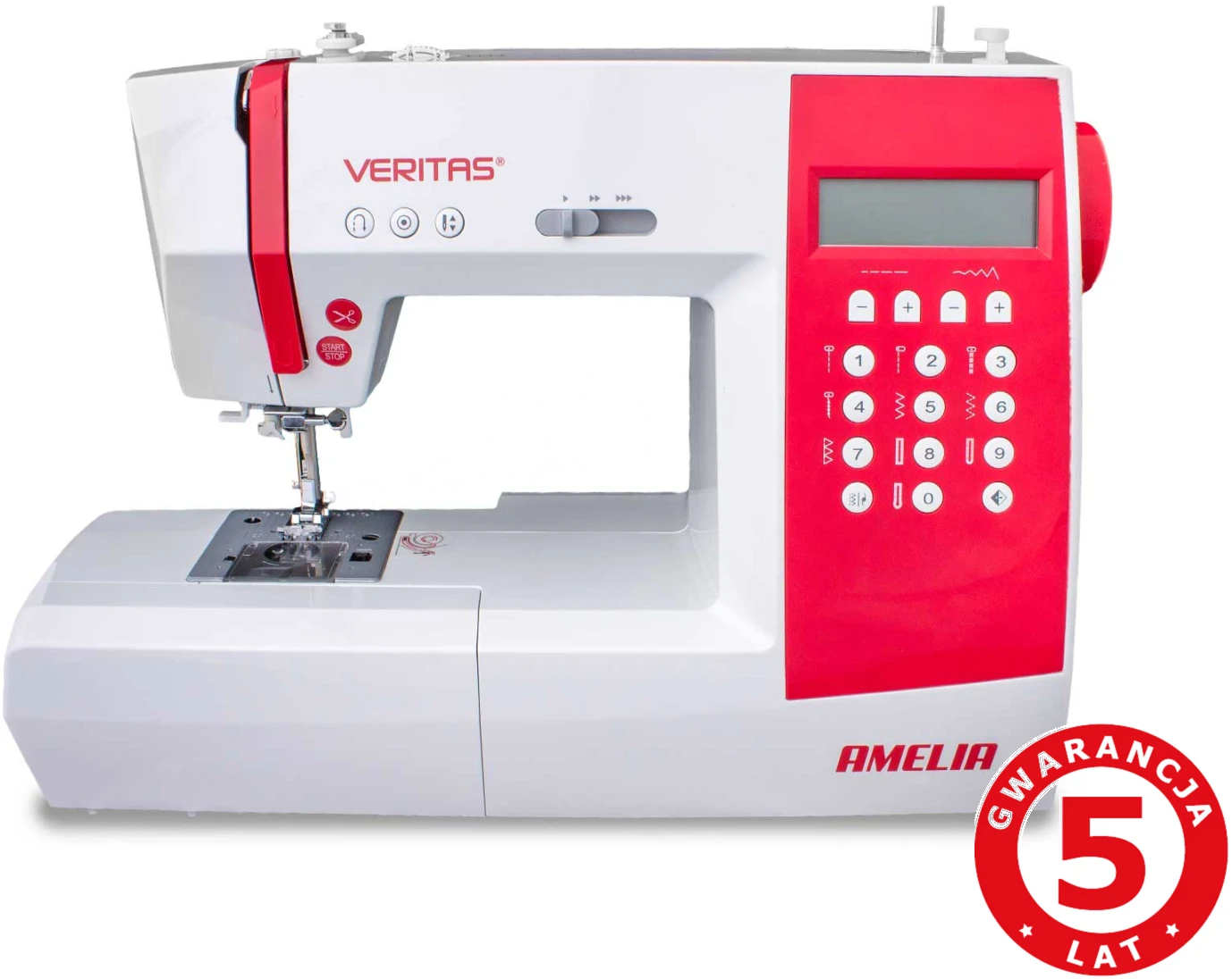 Dzięki wyborowi 90 programów ściegów VERITAS Amelia nie ogranicza Twojej kreatywności. Posiada praktyczne ściegi elastyczne i owerlokowe, 7 różnych rodzajów dziurek wykonywanych automatycznie na wymiar guzika oraz liczne ściegi do pikowania i ozdabiania. Każdy program jest wstępnie zaprogramowany z optymalną szerokością i długością ściegu. Maszyna posiada wspaniałe komfortowe funkcje: w pełni automatyczne obcinanie nici, automatyczny nawlekacz igły oraz możliwość pracy bez regulatora obrotów. Bardzo przydatna jest także funkcja wiązania ściegu czy pozycjonowania igły góra/dół.