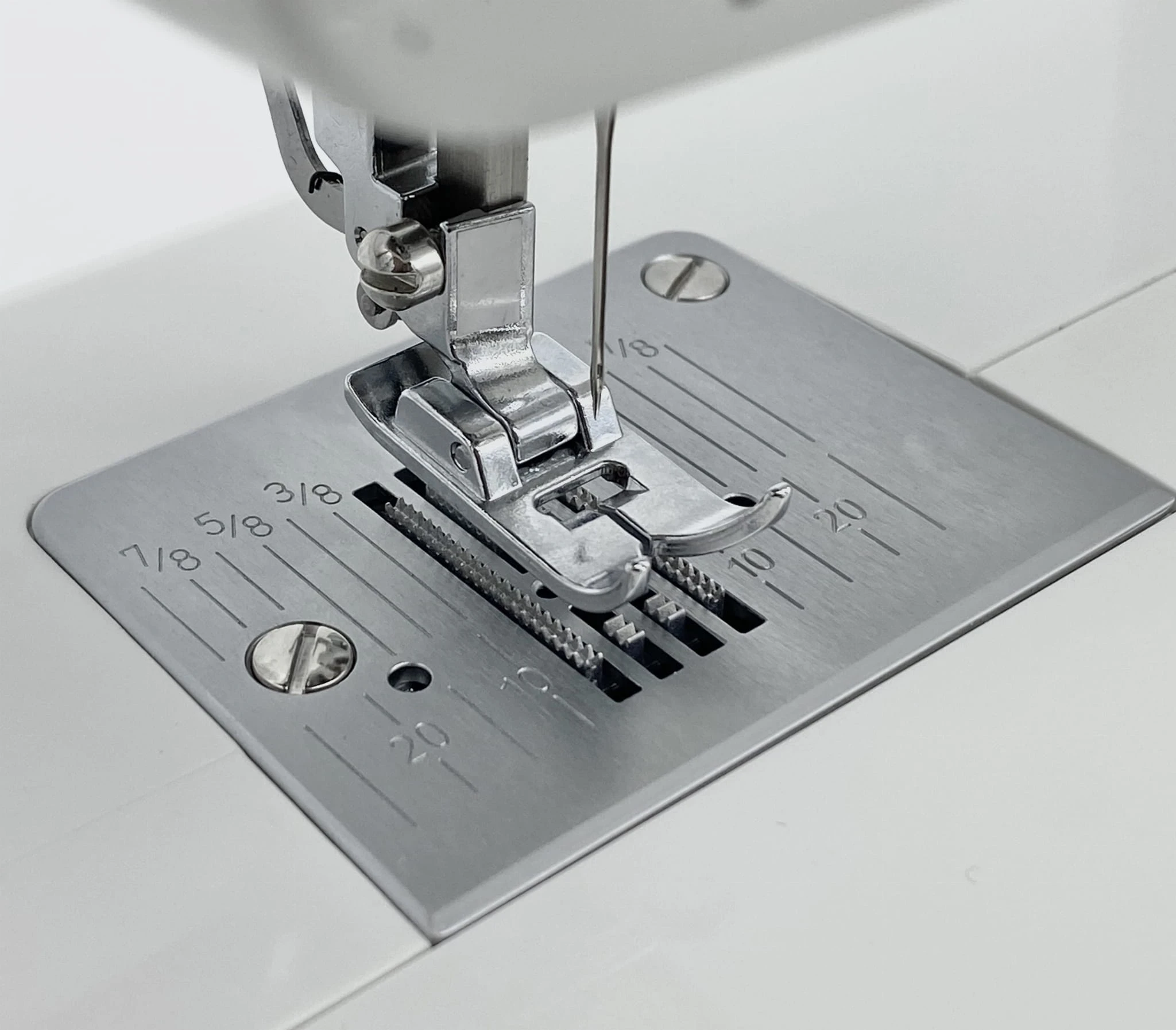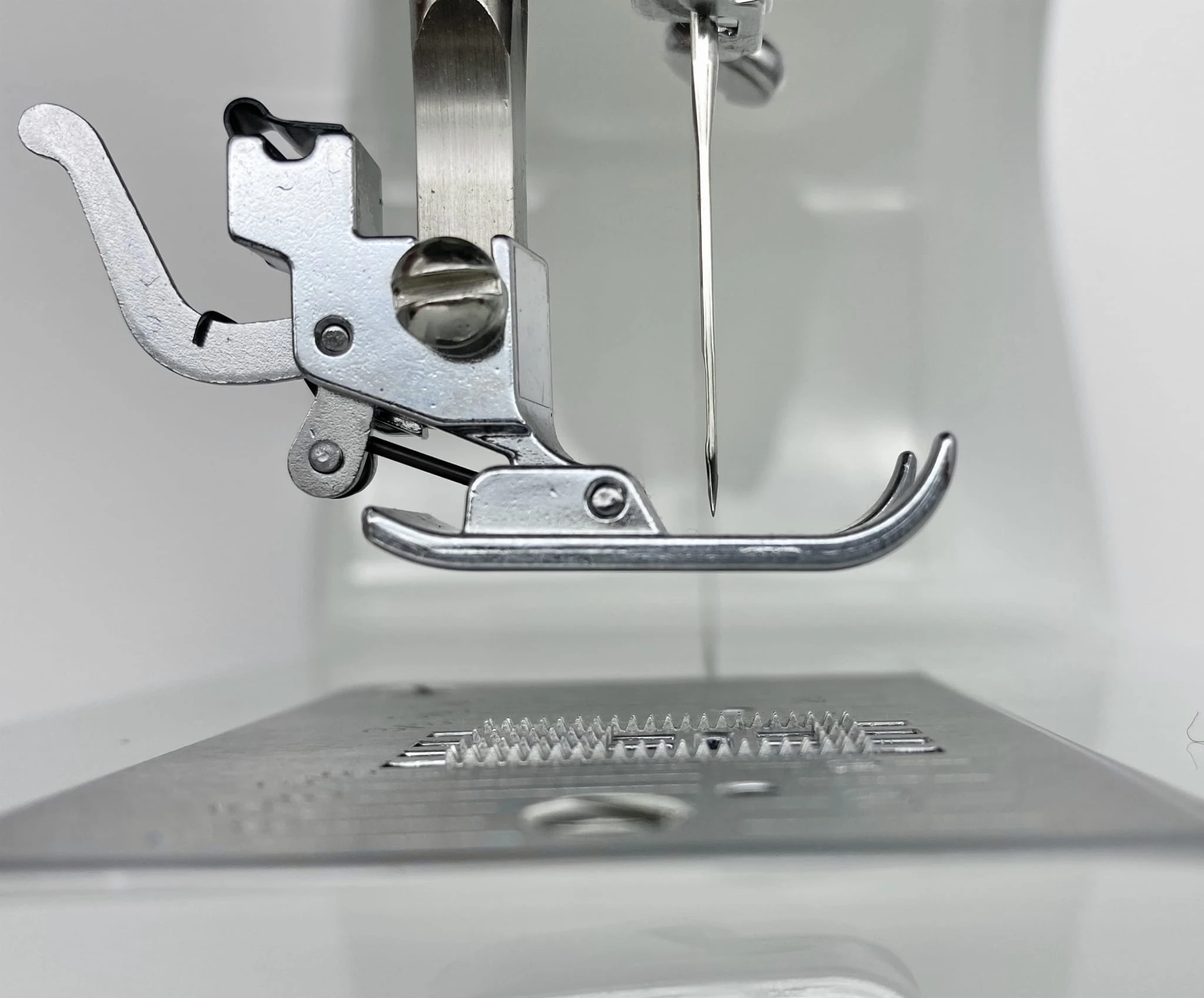 - Regulacja docisku stopki – precyzyjne prowadzenie tkaniny