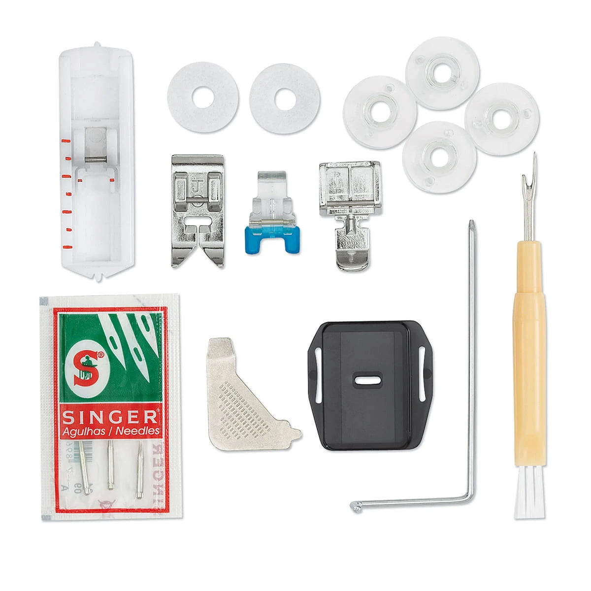 Bogaty zestaw akcesoriów sprawia, że nie trzeba dodatkowo inwestować, aby wykonać bardziej złożony projekt czy po prostu wszyć wygodnie suwak.