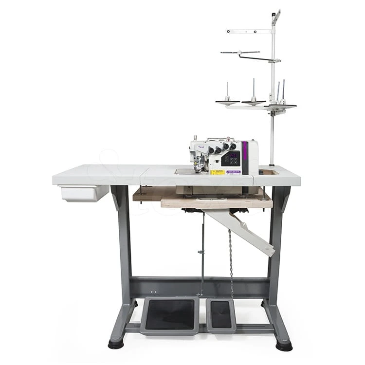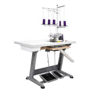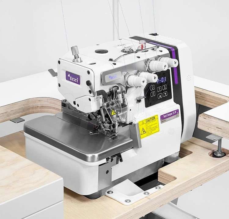 TEXI CINQUE 35 N PREMIUM EX to kompletna maszyna szwalnicza na regulowanej podstawie STAND TEXI PREMIUM SILVER i wysokiej jakości blacie z 30 warstwowej sklejki TABLE TOP TQC T TEXI PREMIUM. Stoły TEXI zostały zaprojektowane z myślą o przemyśle tekstylnym. Są pokryte specjalnym strukturalnym laminatem, który skutecznie zabezpiecza przed wycieraniem i odpryskiwaniem oraz szkodliwym działaniem wilgoci i oleju. Wszystkie owerloki TEXI są montowane na obniżonym podblacie - dzięki temu powierzchnia stołu i płytka ściegowa tworzą jedną płaszczyznę.